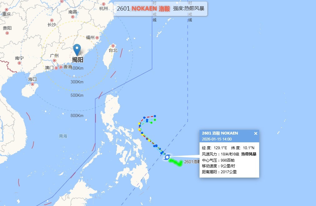 今天(15日)14时,位于菲律宾群岛以东洋面的热带低压加强为2026年第1号台风“洛鞍”,其中心位于菲律宾马尼拉东偏南方向约1010公里的洋面上,中心附近最大风力8级(18米/秒)。
