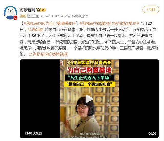 据4月20日晚间报道,脱口秀演员颜如晶发布的一则视频,在平静的日常里投下了一颗“深水炸弹”。视频里,身在马来西亚的她,坦然向观众展示着自己正在做的一件大事——为自己挑选一块墓地。这位36岁的公众人物直言,自己的人生已正式迈入下半场,而提前规划“人生最后一处不动产”,是她深思熟虑后的决定。