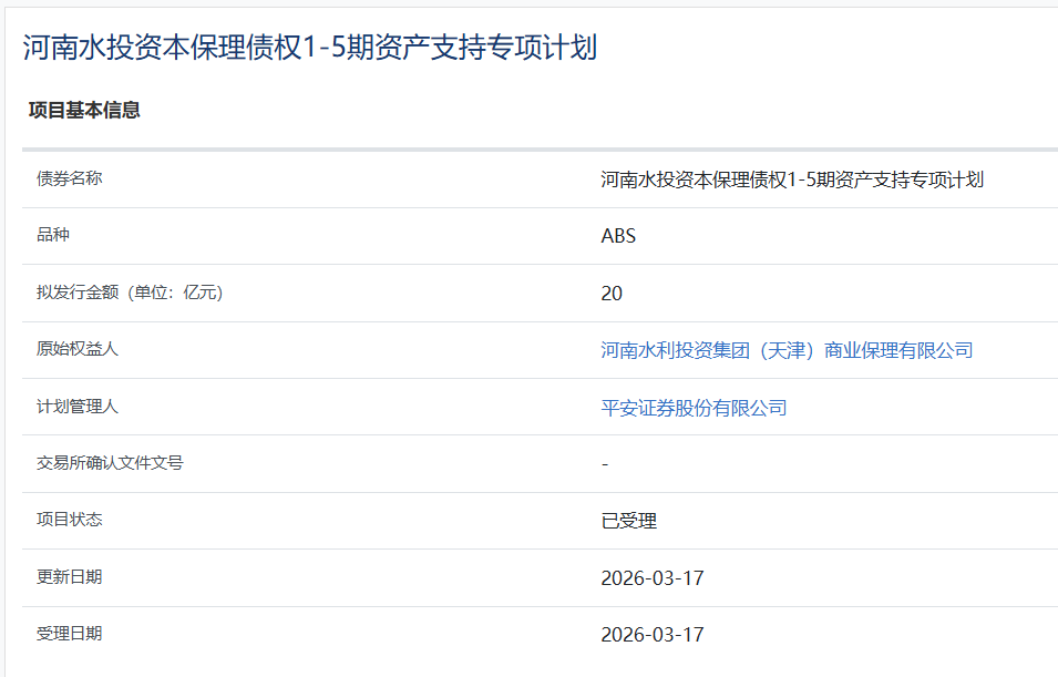 【大河财立方消息】3月17日, 河南水投资本保理债权1-5期资产支持专项计划项目获上交所受理。